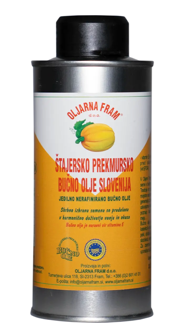 El aceite de calabaza Oljarna Fram es un auténtico tesoro gastronómico de Eslovenia, elaborado con semillas de calabaza seleccionadas y tostadas según el método tradicional de la región de Štajerska–Prekmurje, reconocido con denominación de origen protegida (DOP).